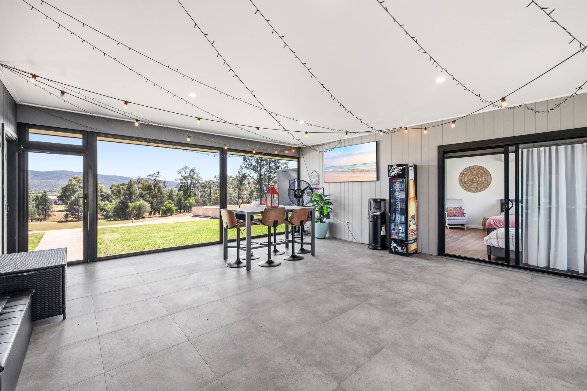 Large glass sliding doors open onto a magnificent alfresco entertaining area. Whether hosting family BBQs, quiet afternoon drinks, or celebratory events, this space is designed for enjoyment in all seasons.