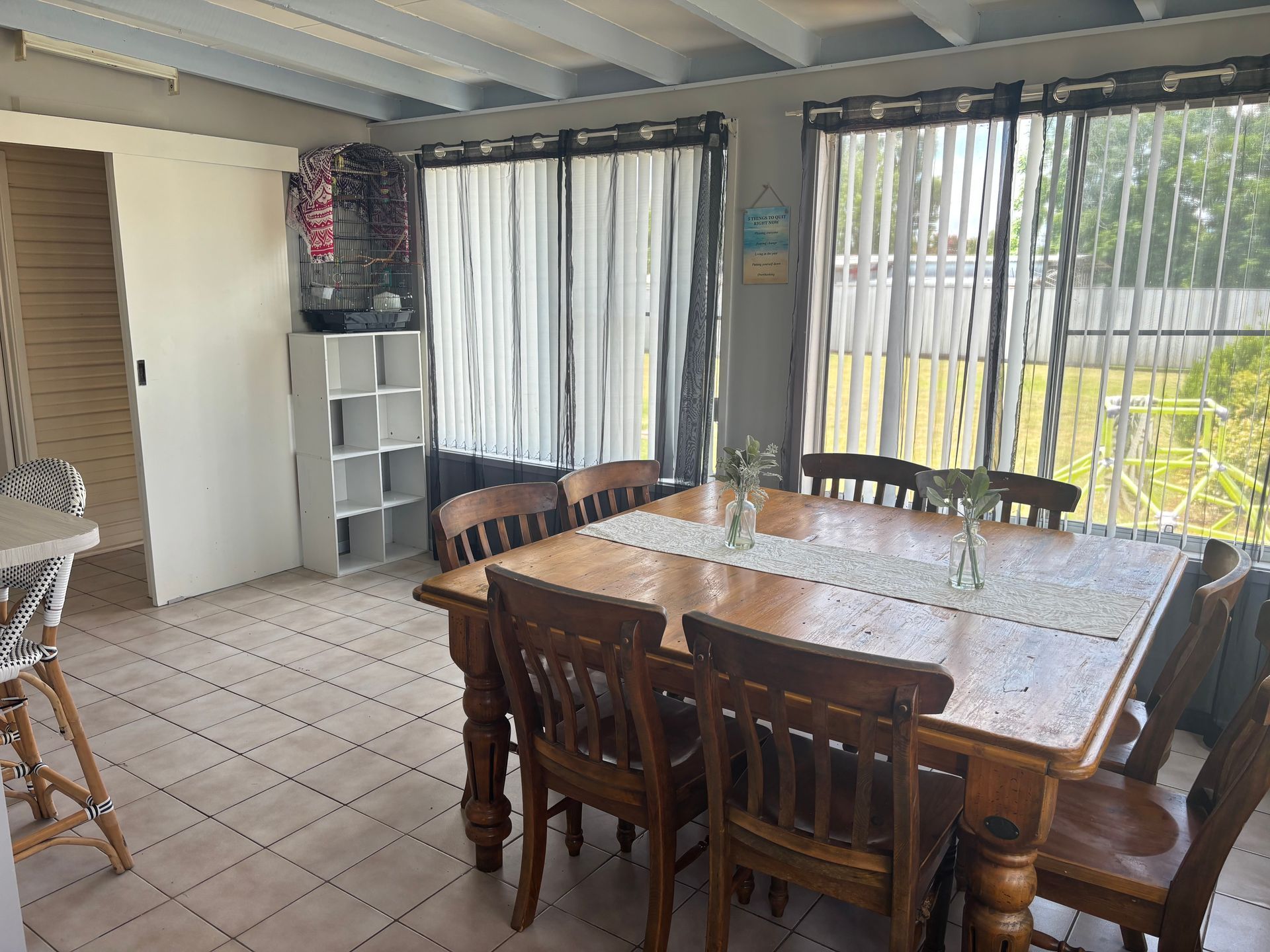 The bathroom includes a shower and vanity, complemented by a separate toilet. The kitchen is equipped with an electric stove and benefits from a second reverse-cycle air conditioner, linking seamlessly to the adjoining dining room.