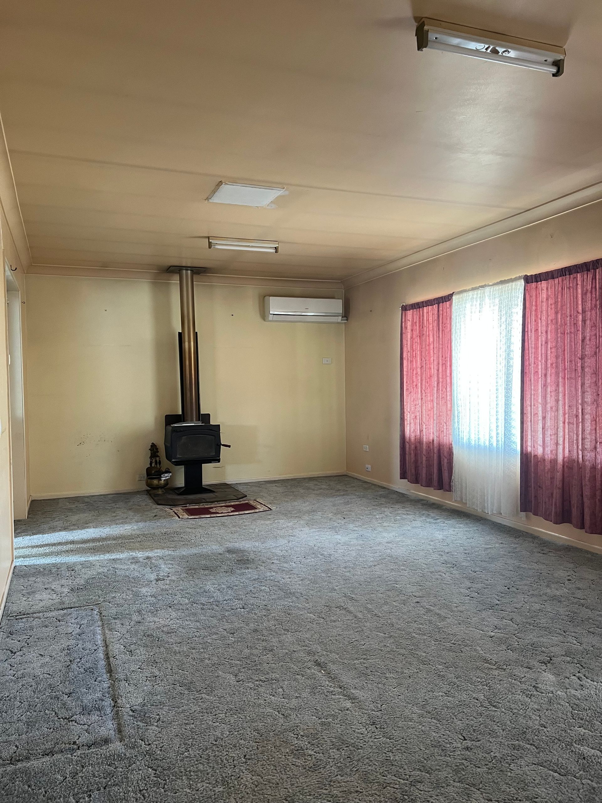 Inside features a spacious loungeroom with split system air conditioning and a cosy wood fire, complemented by a large kitchen with ample cabinetry. The main bedroom is generously sized, and the home includes a separate toilet for added convenience.