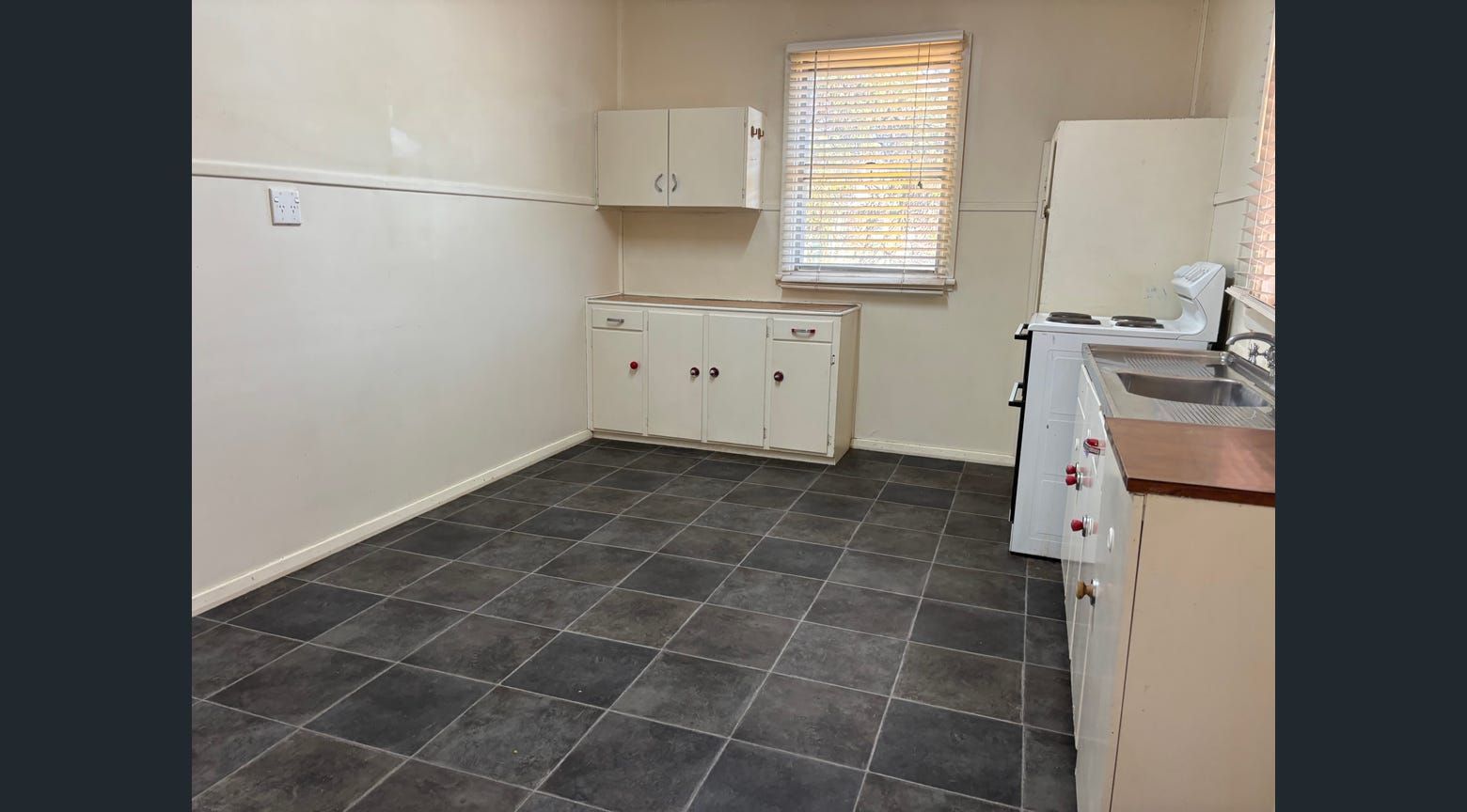 The property features two bedrooms and a welcoming lounge room fitted with air conditioning for year-round comfort. The older-style kitchen is neat and highly functional, providing practical workspace and storage. The bathroom includes a toilet, vanity and walk-in shower for easy accessibility.