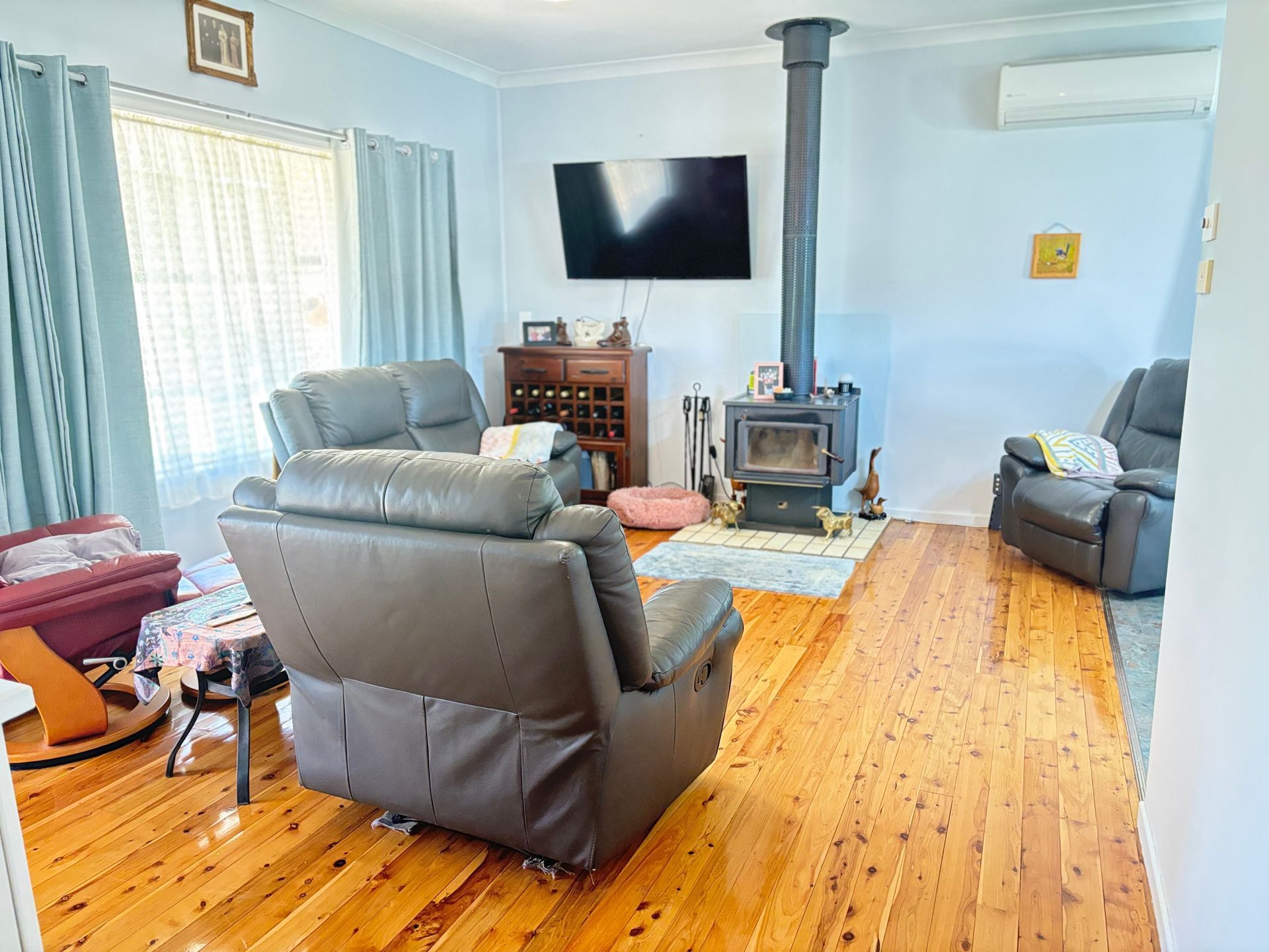 Step inside to a spacious loungeroom featuring stunning polished timber floors, a reverse cycle air conditioner, and a cosy wood fire, creating the perfect space for relaxing all year round. The home offers three generously sized bedrooms, all complete with polished timber floors, ceiling fans, and wardrobes.
