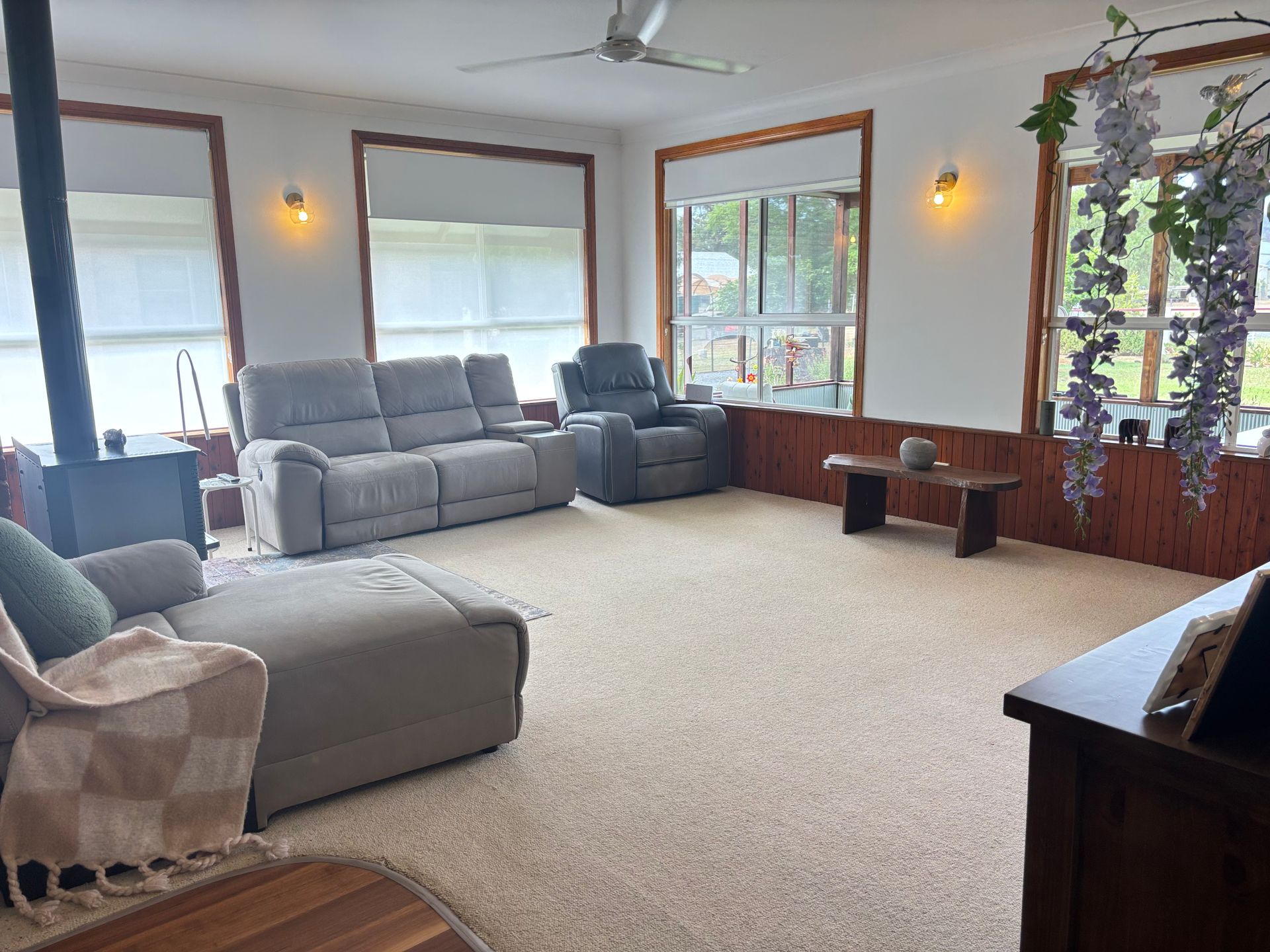 • Expansive living area with wood fire and ceiling fan, perfect for relaxing or entertaining