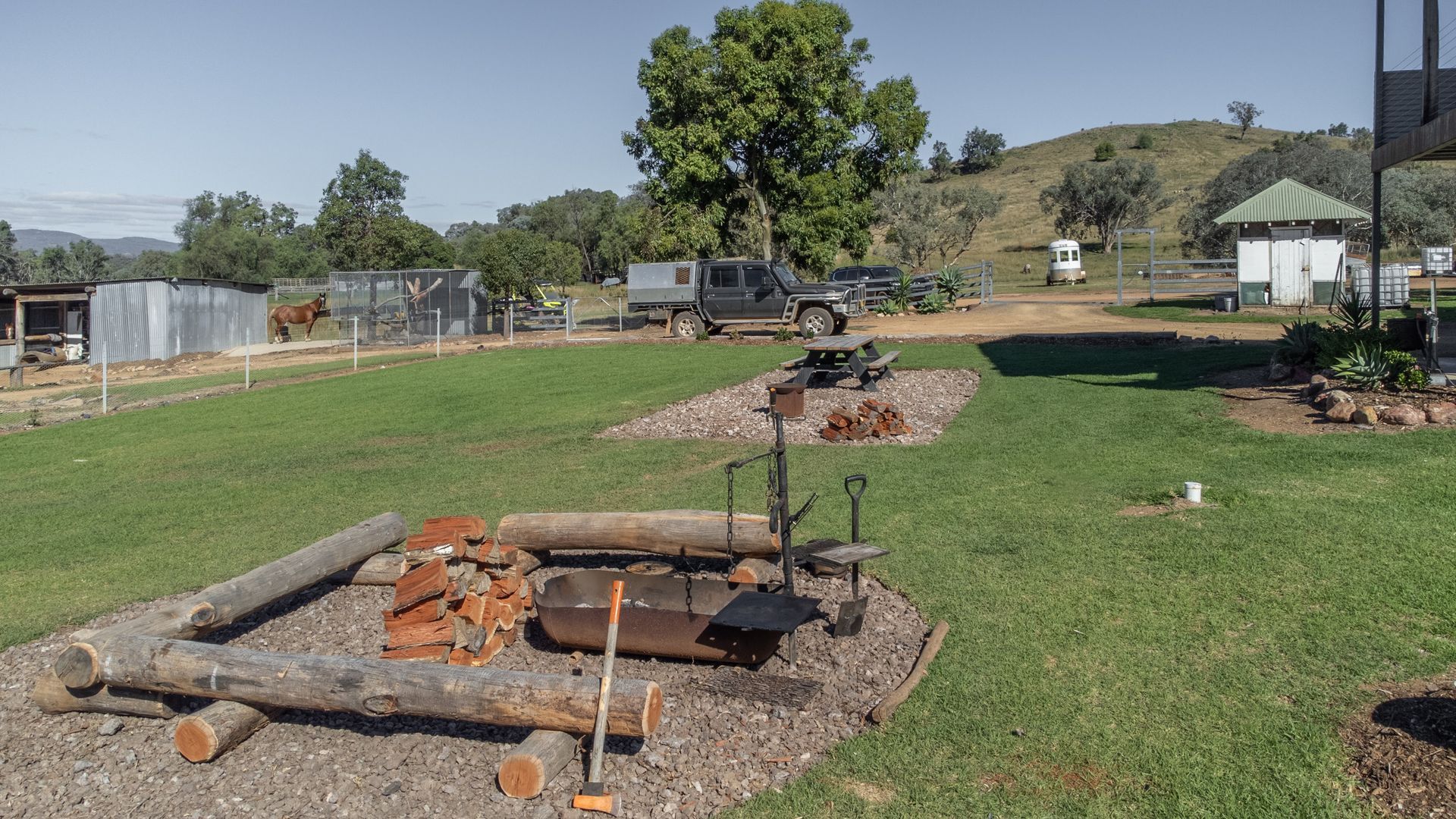 Main shed: 20m x 12m, dirt floor, partially enclosed